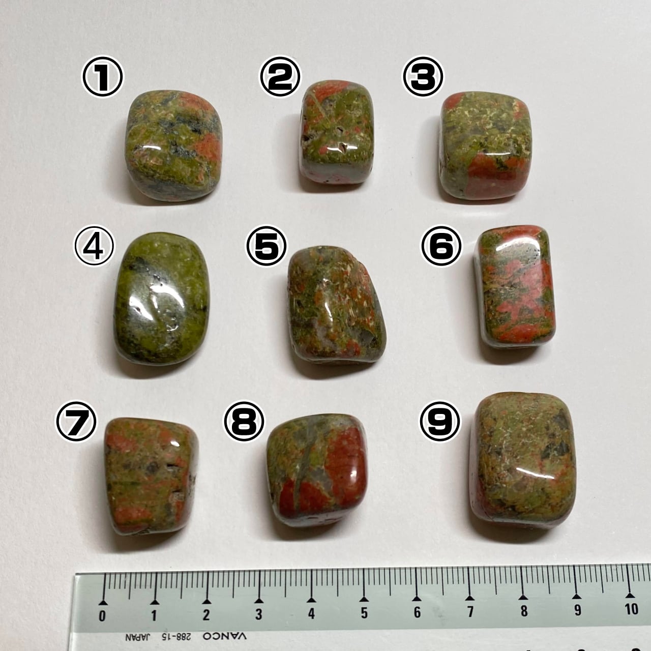 個人的に好きな石、ユナカイトです。他の石をご購入のついでにいかがでしょうか。 2枚目の写真は1枚目を裏返しただけのものです。 番号から選んでご注文いただけます。